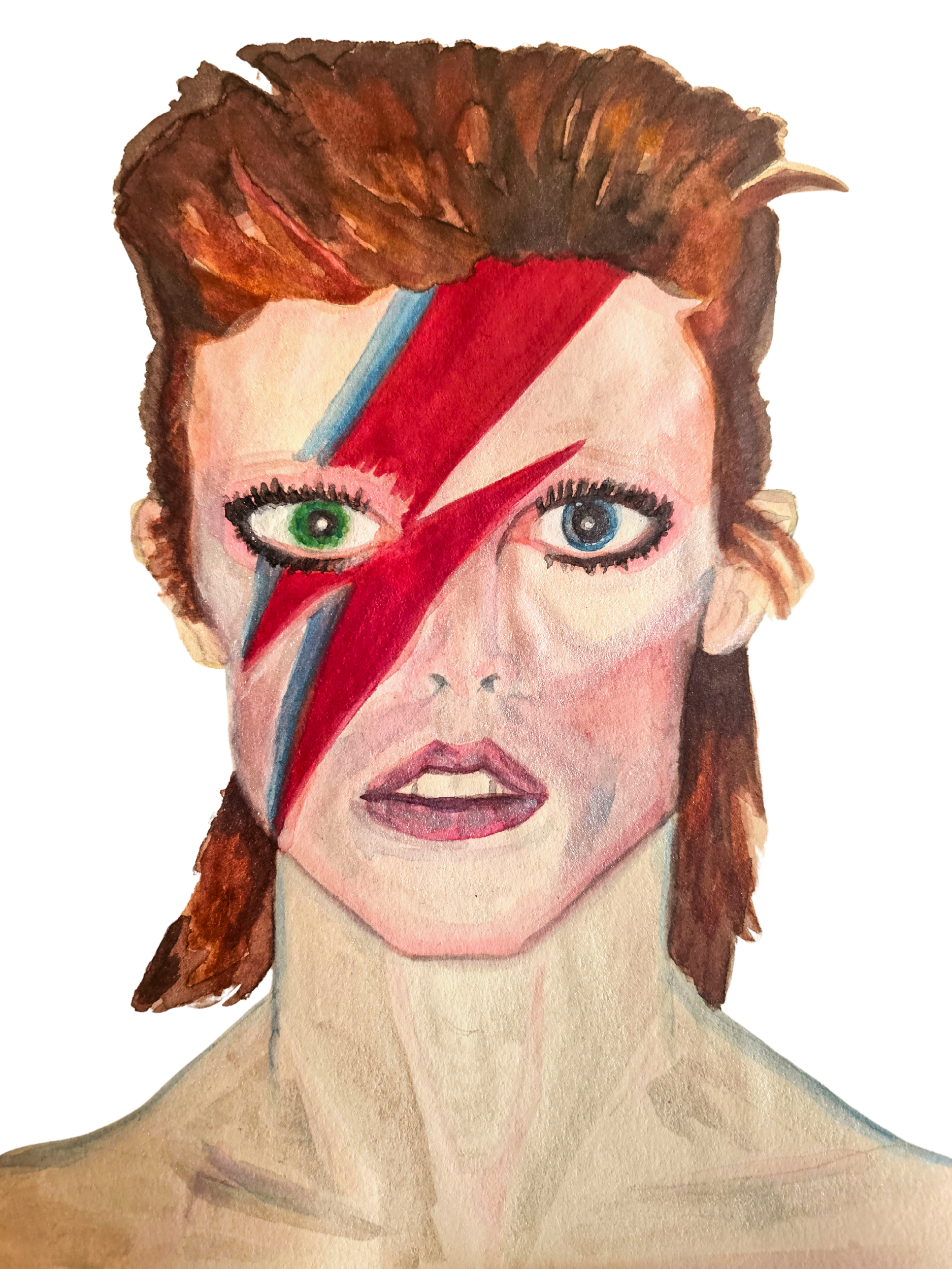 Tested metallic watercolours on a David Bowie portrait. The pigments create a delicate shimmer in light—perfect for winter glamour. Metallics layer over the wash to highlight cheekbones, collars, and costume details; from some angles the shimmer reads lunar, echoing Bowie’s otherworldly presence. From afar, it’s a refined glow; up close, the pearlescent granulation reveals texture and layers. At this festive time of year, I love to create new Glam Rock pieces to get me in the dancing mood.