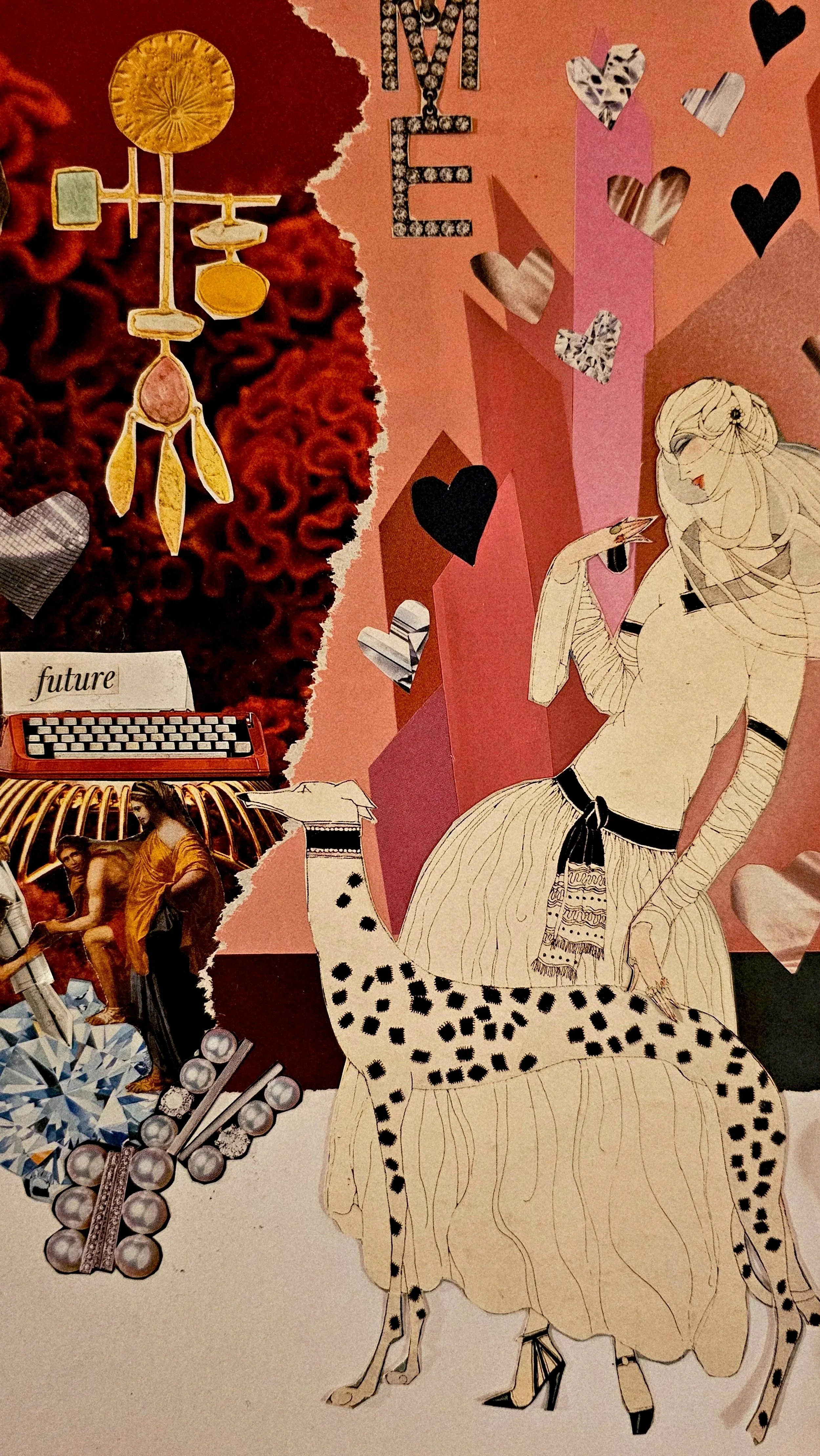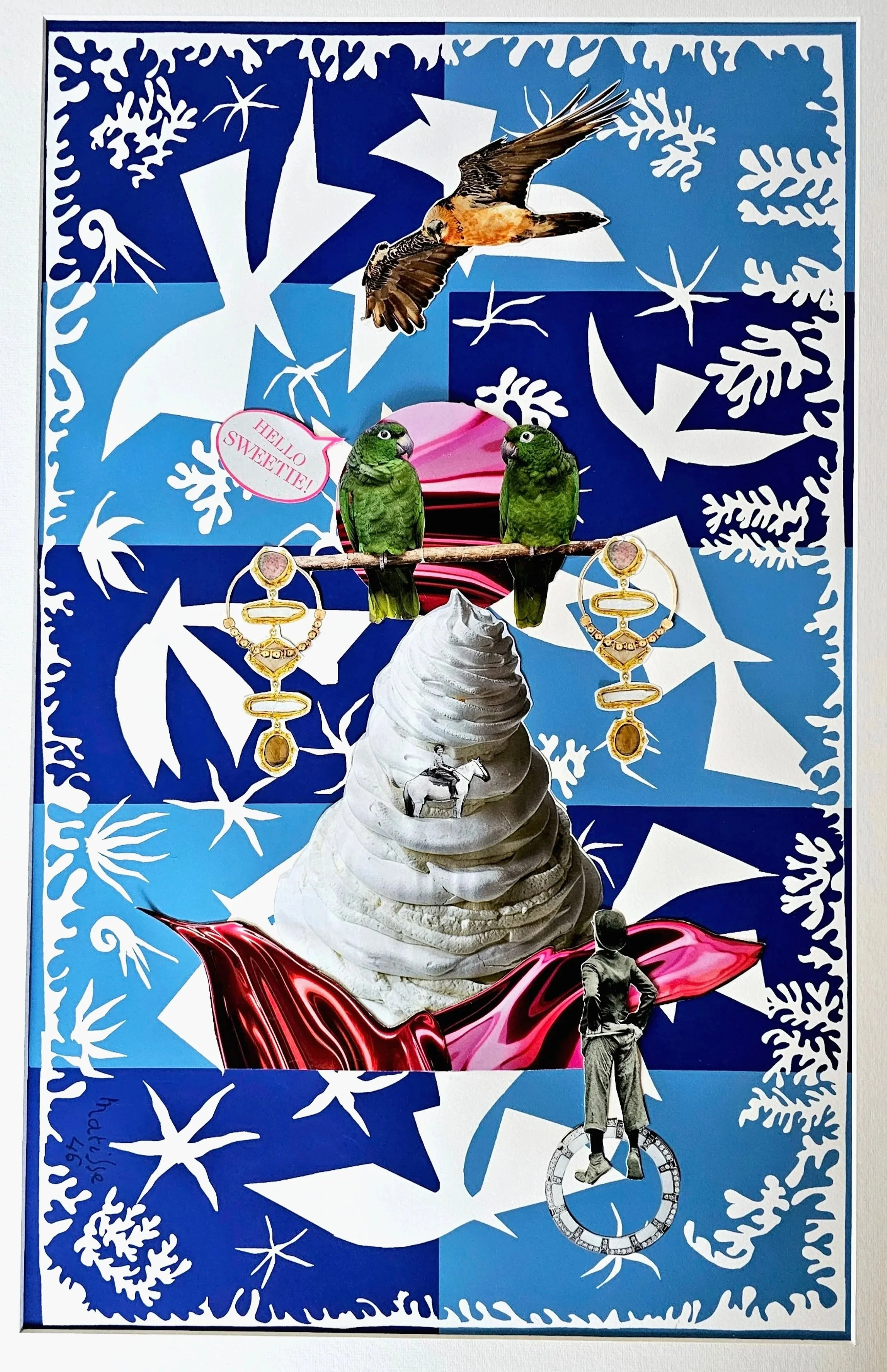 Time to create a vivid, bright piece for winter, something surreal and luminous enough to carry my eyes through the gray months; using collage and a rediscovered print of Matisse, the original white background — once a quiet field of negative space — erupted into a choreography of abstract birds and fragments of nature, paper wings layered with torn leaves and snippets of horizon, each element both in concert and a beat apart, so the composition reads like wind itself, a slow, musical flutter that pulls color through frost, turning cold into movement and the season into a living, breathing moving, melting landscape. That sits especially delicious next to a liquid fire. Charlie Chaplin nods to the past as he watches from afar the young woman on her horse, perhaps she is riding to the top? For a better look. The vulture’s view is dazzling as he glides to see the parakeets in an unusual place. Look closer to see the jewels hanging as if magically balanced and suspended in the air.”